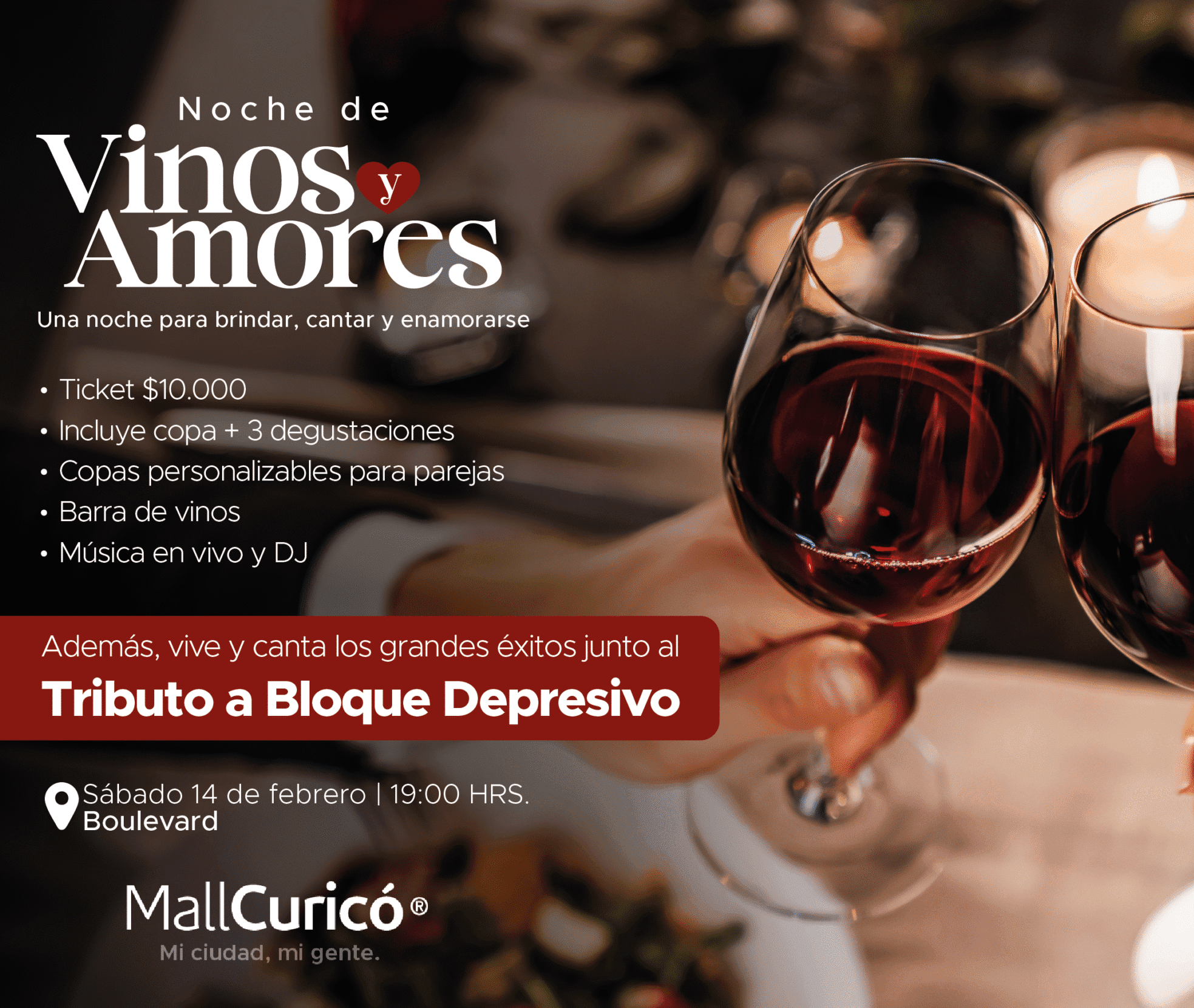 Este sábado 14 de Febrero a las 19. 00 horas en el Boulevard de Mall Curicó, te acompañamos a brindar por el amor junto a tu persona favorita, con la mejor selección de vinos veraniegos del Valle de Curicó, y con la participación especial del tributo a BLOQUE DEPRESIVO, a cargo de la banda porteña «Los Precisos 5» , grandes éxitos románticos para cantar a todo pulmón, y muchas sorpresas más.